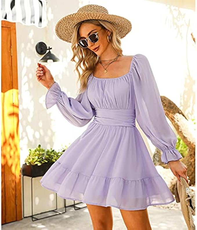 EXLURA 女式系带长袖方领褶皱连衣裙松紧腰休闲迷你连衣裙